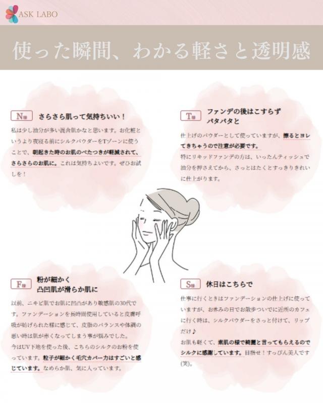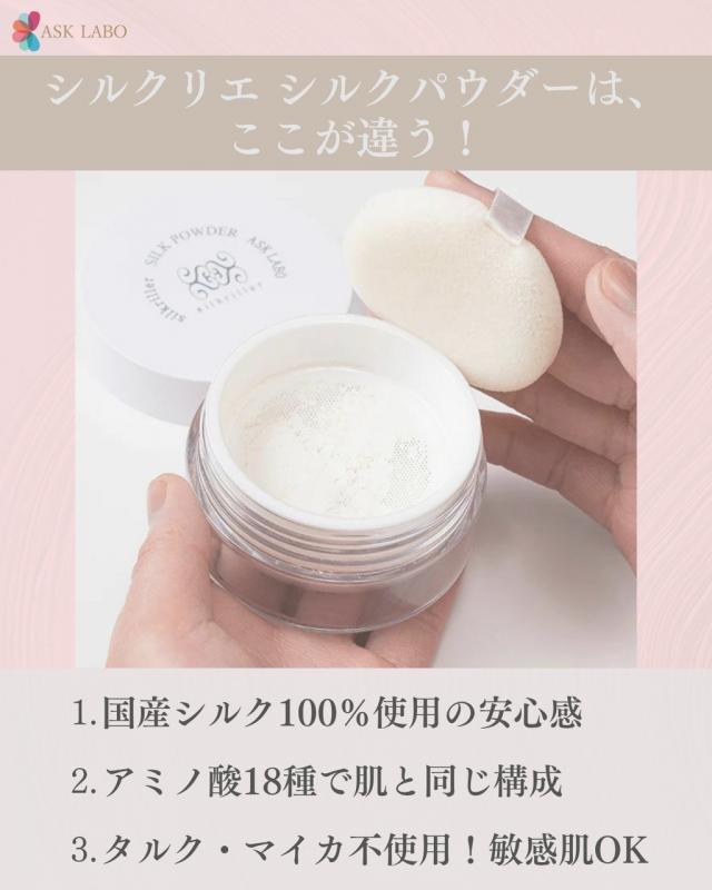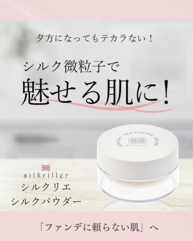 シルクリエ シルクパウダーは、国産シルク100%使用、しかも国内で丁寧に管理された高品質なシルクだけを使用した、今注目のスキンケア発想パウダーです。