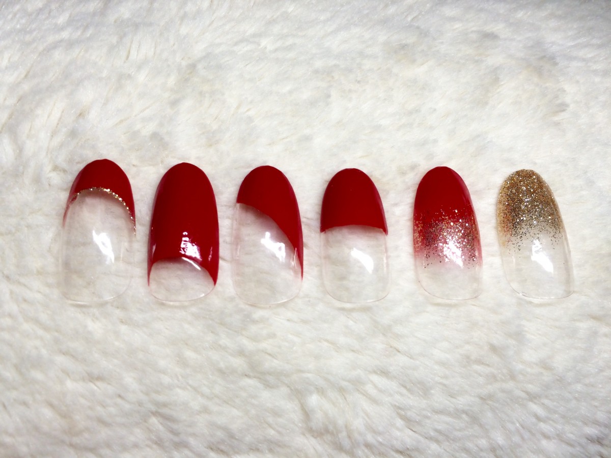 左からフレンチ、逆フレンチ、斜めフレンチ、フラットフレンチ、カラーグラデーション、ラメグラデーションです♪