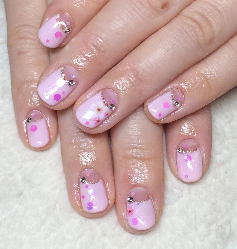 ピンクのベースに桜とホログラムをちらしたデザインです(∩´∀`∩)